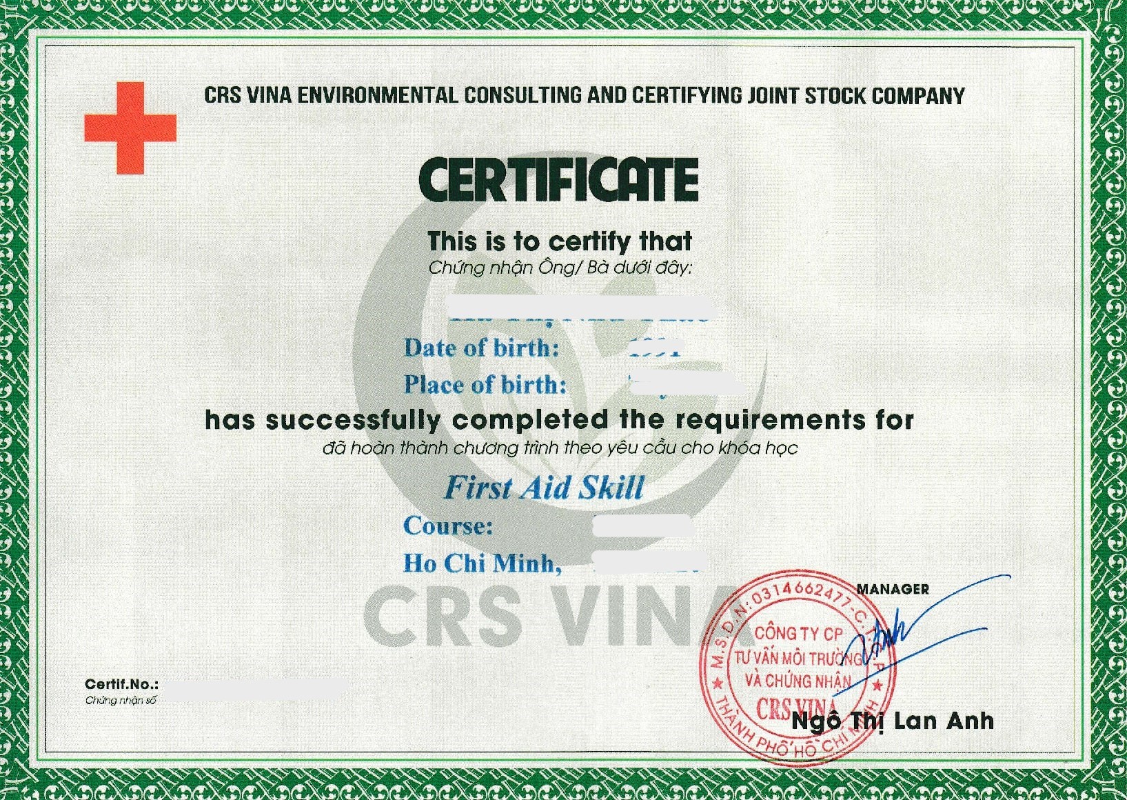 V. Chứng chỉ sơ cấp cứu